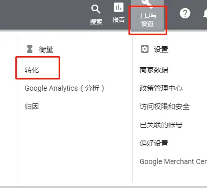 1、打開Google Ads,點擊工具與設定,點擊轉化