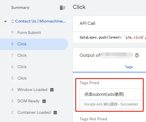 6、做出相應動作後,檢查GTM裏,程式碼是否被觸發。 觸發成功是在Tags Fired